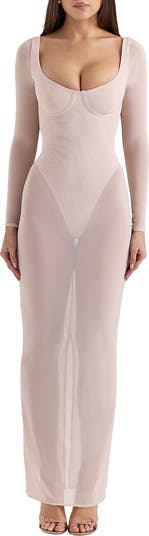 Feel your most stunning in this sheer maxi dress that gets a whisper of coverage from a tonal bodysuit-inspired lining.