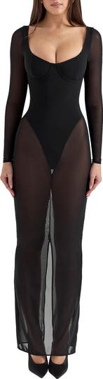 Feel your most stunning in this sheer maxi dress that gets a whisper of coverage from a tonal bodysuit-inspired lining.