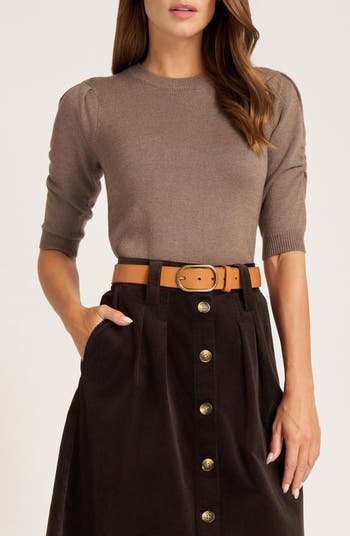 Soft ribbing and a cashmere-kissed knit shape this desk-to-dinner sweater knit with a classic crewneck and abbreviated sleeves.