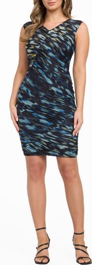 Asymmetric rushing and a blurry print give a slightly edgy vibe to this curve-hugging body-con dress made of stretchy mesh.
