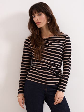 Your everyday striped top, with a contemporary update. Designed in a chic but versatile black and camel colourway, this long-sleeve top features gorgeous draping that instantly elevates this classic style. Wear with your favourite jeans and trousers for a look you’ll wear on repeat.