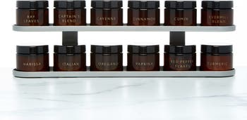 Organize your spices in the most elegant way with this countertop spice rack that comes with 12 amber glass jars and coordinating organic spices. This rack can also be mounted to your wall.