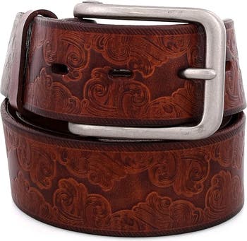 Everton is a stamped leather belt with a scroll pattern design. Perfect for the groom or any other formal attire, Everton will take your belt game to the next level. Change up the look with your own buckle, as this silver metal one is removable.
