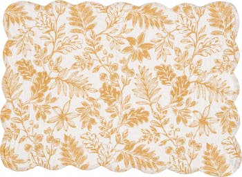 Everview Gold 100% Cotton Set of 6 Cloth Placemats brings refined botanical style to everyday dining and seasonal entertaining. Each placemat measures 13 x 19 inches and features a warm gold floral design finished with a decorative scalloped edge for a polished tabletop presentation. The reversible construction provides two coordinated looks in one set, allowing you to refresh your table without replacing your core linens. Crafted from 100% cotton, these placemats offer a soft hand with reliable durability for frequent use. They help protect dining surfaces from plates, heat, and everyday mess while adding visual structure to each place setting. Designed for all seasons, the floral motif transitions effortlessly from spring and summer gatherings into fall and autumn harvest tables, pairing smoothly with both neutral and colorful dinnerware. This set includes six matching placemats to create a complete, cohesive table for family meals and guests. Machine wash care supports easy upkeep, making them well suited for regular rotation in busy kitchens.