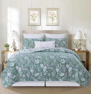 Discover holidays in bed-scapes with our new reversible and machine washable quilt sets these upcoming holiday and seasons, from botanical, to coastal to festive and classic elegance, we bring you all about them in trendy, timeless and fresh designs and motifs suited for your diverse home décor tastes and demands. Stay with, and accompany us during our continued magical home décor ventures any season once again year after year. Bring subtle, nature-inspired sophistication to any bedroom with the Everview Sage Quilt Set. Featuring a delicate rosebud stitching pattern, this quilt showcases graphic, artistic renderings of various foliage in distressed white against a soothing sage green background, creating a refined, year-round botanical look. Reversible for versatile styling, the quilt flips to the same pattern in opposite colors, sage foliage on a crisp white backdrop, offering two complementary looks in one. Perfect for curating botanical, transitional, or nature-inspired bedroom collections, Everview Sage blends understated artistry with timeless appeal. Love this look? Everview Sage is also available as a quilted table linen collection.