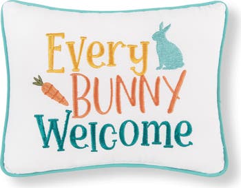 - Welcoming embroidered pillow features playful "Every BUNNY Welcome" sentiment with "Every" in golden yellow, "BUNNY" in coral orange, and "Welcome" in turquoise, adorned with charming turquoise bunny silhouette and orange carrot with green top embroidered throughout the text on crisp white background.