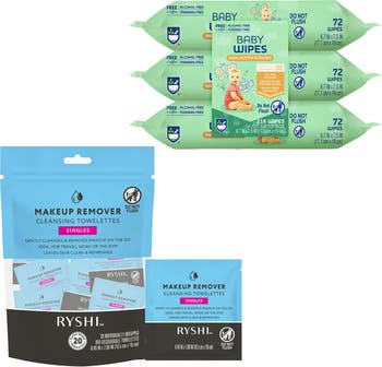 - Baby Wipes with Aloe & Shea Butter Give your little one the gentle care they deserve. Made with 99% purified water and plant-derived ingredients, these wipes are safe for sensitive skin. Infused with soothing aloe vera and a light touch of shea butter, they calm irritation while leaving skin soft and fresh. Perfect for diaper changes, sticky hands, or quick cleanups at home and on the go. Makeup Remover Cleansing Towelettes (Individually Wrapped) Stay fresh anytime, anywhere with biodegradable wipes that remove dirt, oil, sweat, and even waterproof makeup—no rinsing required. Each ultra-soft towelette is individually wrapped for hygiene and portability, making them ideal for travel, gym bags, or long days on the move. Why You’ll Love This Bundle: Gentle, water-based wipes for babies + refreshing towelettes for adults Safe, skin-friendly ingredients with no harsh chemicals Eco-conscious choices: biodegradable + non-toxic formulations Perfect for home, travel, diaper bags, gym bags, and more Convenient resealable and individually wrapped packs keep wipes fresh.