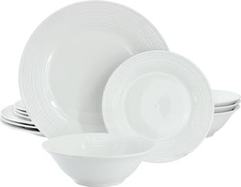 The Gibson Home Everyday Embossed 12 Piece Round Ceramic Dinnerware Set adds a sleek touch to any tabletop. The rim of each piece in this stylish set features a series of concentric circles that provides this classic white dinnerware set with a contemporary look. Crafted from quality ceramic, this collection is durable enough for everyday mealtime. Dishwasher safe for easy cleaning and microwave safe for fast reheating