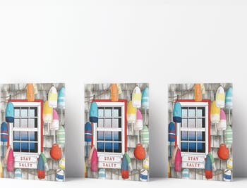 This 3-pack of Everyday greeting cards is elegantly illustrated by artist Ingrid Ramus, founder and owner of the Ramus & Co brand. Front artwork features "stay salty" buoys on a shed. The cards are blank inside. All greeting cards are made in the USA on heavyweight uncoated and locally-manufactured card stock. Each card is individually wrapped in TUV Austria certified-compostable PLA sleeves. Each card is accompanied by a hand-embossed envelope made with heavyweight 95lb paper and a peel-and-stick flap - no licking envelopes here! All Ramus & Co. greeting cards are printed on FSC and SFI certified paper sourced from a regional mill that harnesses 66% of its energy from on-site sustainable sources, such as emission-free hydroelectricity and biomass co-generation from wood waste. Additionally, our greeting cards are thoughtfully packaged in bags made from certified compostable PLA material. Husband-and-wife team Calvin and Ingrid Ramus founded Ramus & Company in 2019, in New England, USA. Ingrid, the creative designer behind the brand, originates from Mexico, where she cultivated her skills in fashion and textile design. Drawing from her unique and inquisitive perspective on preppy style, Ingrid prolifically designs whimsical yet classic stationery and lifestyle items.