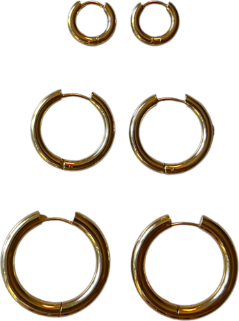 Everyday layering hoops! Lightweight and classic :) S: 13mm M: 16mm L: 20mm These hoops are 22k gold vacuum plated stainless steel which makes them water-resistant and perfect for those with brass allergies! They have an easy clasp closure and provide optimal comfort with no post