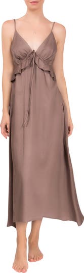Breezy linen and ruffle trim enchant a V-neck nightgown fashioned with a flattering Empire waist and a comfortable smocked back panel.