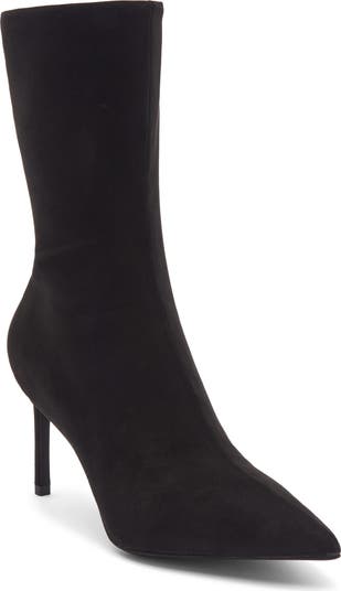 A center seam highlights the angular nature of this pointy-toe bootie balanced on a steep stiletto heel and secured with a quick side-zip closure.