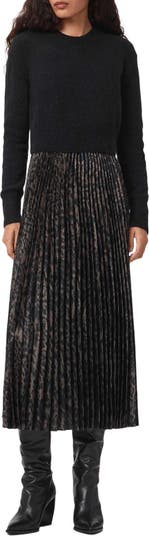 An alluring animal print and impeccably pleated skirt make this sleeveless dress a spotlight-ready stunner, while the coordinating sweater provides a comfortable layer that lets you mix up your look.