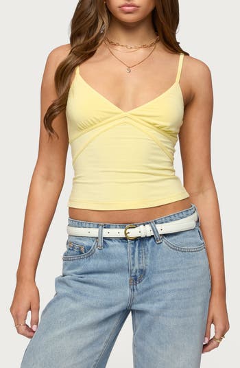 Double piping traces the front of this stretchy cami complete with flirty back ties.