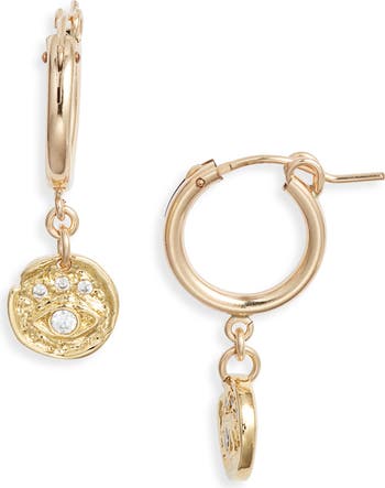 Bring a touch of talismanic whimsy to your look with these handmade huggie hoops featuring evil-eye charms set with sparkling cubic zirconia.