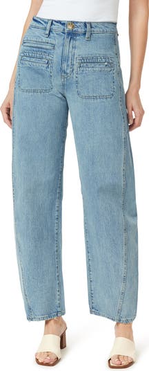 Angled seams bring modern appeal to these barrel-leg jeans cut from low-stretch denim in a stylish wash.