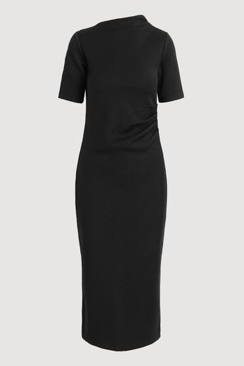 A sleek, knit dress with directional ribbed details — Evie is perfect for transitioning through the seasons. Featuring an asymmetrical neckline and ruching on the side for ease, you'll find yourself reaching for this dress for any occasion.
