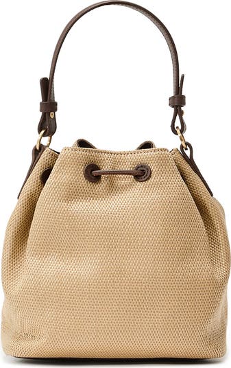 A finely woven exterior and smooth leather trims brings textural interplay to a voluminous bucket bag fitted with an optional crossbody strap for hands-free wear.