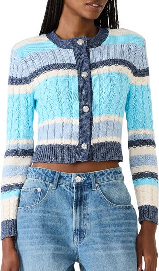Bold stripes interspersed with marled yarn and cotton cables bring textural interest to this chunky cotton-blend cardigan knit in a cute cropped length.