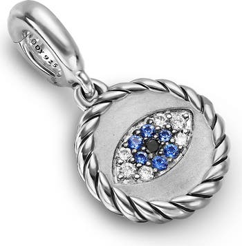 Ward off bad energy while looking stunning with a sterling silver evil eye charm composed of sapphires and diamonds that can be worn on your favorite chains.