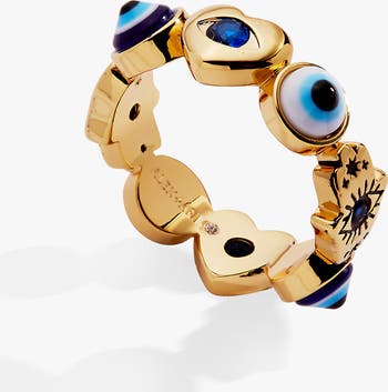 Bring a touch of playful charm to your jewelry collection with the Evil Eye Band Ring. This piece sparkles with clear crystals and features enchanting evil eye glass cabochons paired with delicate etched details. Perfect for those who appreciate meaningful accessories with a whimsical twist, the Evil Eye design represents protection, strength, and empowerment. Its sleek, stackable band silhouette makes it easy to mix and match with your favorite rings, creating a fun, personalized look. Add this versatile and spirited ring to your ensemble and carry a symbol of good vibes wherever you go.