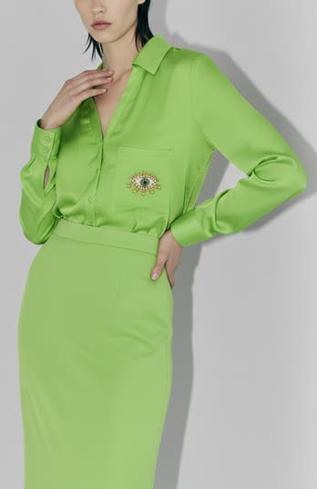 If you are always on the hunt for a beautiful blouse (aren’t we all?), this one is for you. Made with our Sustainable Viscose Satin, this material feels silky and soft against your skin. Hand beaded Evil Eye detailing on the chest pocket will ward off all bad energy, so you can enjoy your day feeling gorgeous. Pair with our Monica Trousers for a full look. This style runs relaxed. Please order your normal size. If you are between sizes, we suggest sizing down for a more fitted look, or sizing up for added comfort.