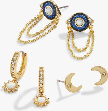 Embrace summer vibes all season long with this mix-and-match Evil Eye + Celestial Earring Set. Show off your elegant sense of style with the evil eye and celestial earring set, including crystal-infused evil eye drop chain studs, crystal hoops with opal stone sun charms, and crescent moon studs with crystals.