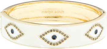 Shimmering crystals neatly outline every evil eye on this large hinged bracelet colored with enamel for a striking appearance against any ensemble.