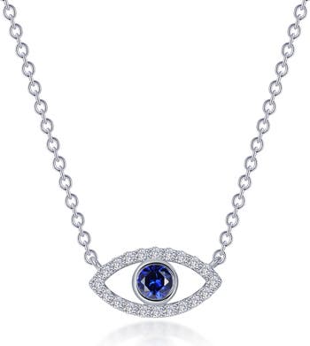 A vibrant evil-eye pendant sparkles with simulated diamonds and lab-created sapphires, creating opulent shine on this hand-polished necklace.