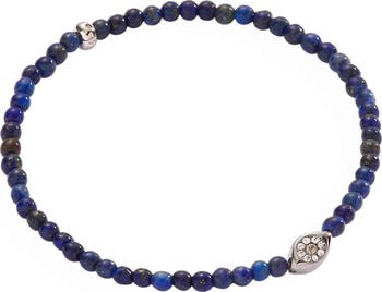 Bold and protective. This deep lapis blue mini stretch bracelet features a silver evil eye charm detailed with blue and clear crystals, plus a shimmering celestial bead to complete the look. Thoughtful, stylish, and perfect for warding off bad vibes—while looking very good doing it.