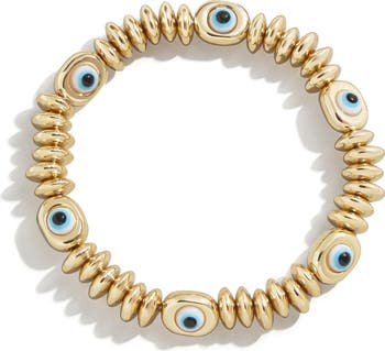 Iconic evil eyes stare boldly out from the stations on this polished bracelet plated in gleaming goldtone plate.