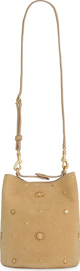 Gilded stars and evil-eye motifs bring celestial shine to this soft bucket bag outfitted with an adjustable, removable strap.