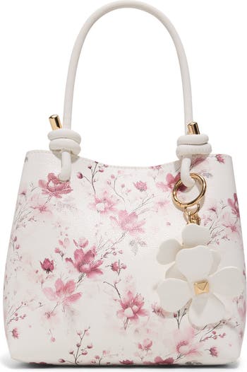 Gleaming hardware and a whimsical floral pattern highlight the structured profile of a spacious faux-leather satchel featuring a divided interior and optional crossbody strap for on-the-go convenience.