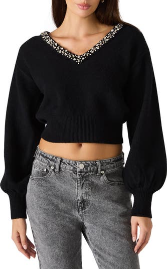 Billowy long sleeves and sparkly stones at the neckline bring the drama to this cropped V-neck pullover that's a glam addition to sweater season.