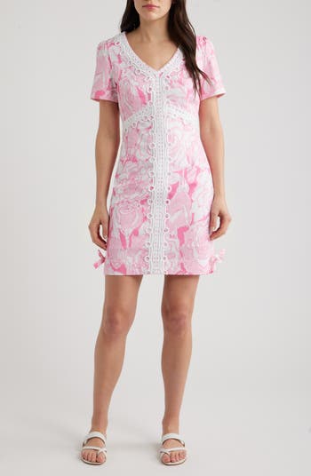 Swirling stitching adds texture and charm to this figure-skimming sheath covered in blushing blooms and framed by puffed shoulders.