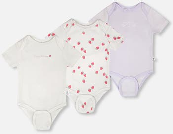 The evolutive cotton jersey 3 pack bodysuit white is a practical and playful essential for baby girls. This set includes three short-sleeve bodysuits: one with a sweet printed message, one with an allover strawberry print, and one in soft lilac with a small strawberry print. Designed with envelope necklines and bottom snap closures, they ensure easy dressing and all-day comfort. The leg snap button closure is evolutive to adapt as she grows. Made from soft cotton jersey and jersey rib with a hint of stretch, these bodysuit are breathable, flexible, and gentle on the skin. A must-have trio from our "B.A.B.Y. Basics" collection, perfect for everyday wear.