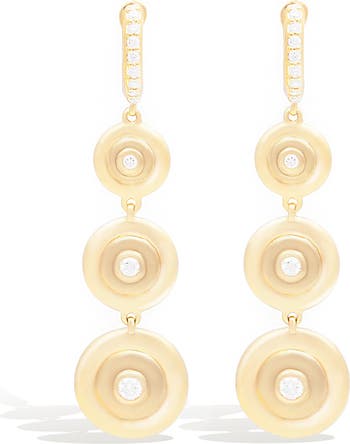 The repeating concentric circle design forming the Evolve Chandelier Earrings symbolizes the cyclical process of constantly evolving to be our best selves. Anchored on a 14k gold diamond huggie, these earrings feature three concentric circle components, each of a different size and each centered on a vibrant diamond.
