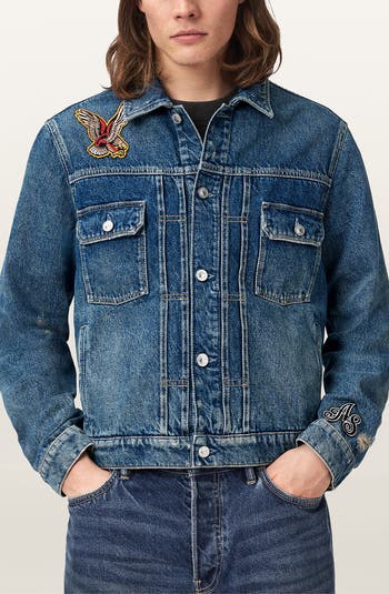Embroidered patch appliquès put a scout-inspired spin on this faded denim trucker jacket that brings an effortlessly cool, just-thrifted vibe to your look.