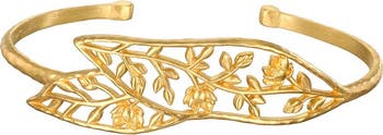 Beauty expands as we open our eyes and hearts to its transformative presence. A delicate, open-work 18kt gold plated cuff bracelet shines with lotus flowers expanding into full bloom, symbolizing new beginnings and full potential—meaningful talismans of transformation.