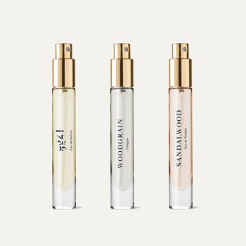 A discovery set of our best Sandalwood scents: Classic Woodgrain with Cedar and Clove; warm 2571 with Amber and Cardamom; and Centuries Sandalwood with Cypriol and Botanical Notes.