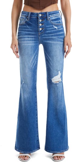Exposed buttons highlight the waist of these stretchy, full-length flare jeans marked with fading and distressing for a lived-in look.