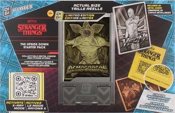 DIGIPLATE STARTER PACK: STRANGER THINGS- Introducing Stranger Things Digiplates, the world’s first functional metal cards. Dive into the thrilling world of Stranger Things with our Demogorgon, Vecna, and Demobat Digiplates. But wait, there's more excitement in store! Each package not only includes three interchangeable licensed Digiplates but also a Digistand . Brace yourself for an immersive experience as these collectible plates come to life through augmented reality and other thrilling digital adventures when scanned. EACH STARTER PACK INCLUDES a Digistand and three interchangeable licensed plates, meticulously etched with intricate artwork from top gaming and pop culture brands. These collectible plates are not only visually stunning but also unlock digital collectibles, accessible through the Digiplate WebApp which can be accessed via the back of each plate. The digital collectibles vary in rarity and are released via gameplay at key times throughout the year, extending the product's lifespan. When scanned, the plates come to life through AR-enabled digital collections, and other exciting rewards. Digiplates seamlessly blend the physical and digital worlds, creating an immersive experience. Start your collection today.