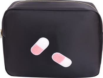 What it is: A spacious nylon bag featuring chenille capsule appliqués at the front.