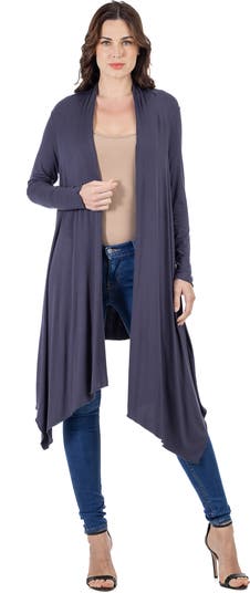 Comfortable and fashionable style, the Extra Long Open Front Cardigan is easy to wear. Featuring long fitted sleeves, below the knee length, and a high low shape this black cardigan is a staple wardrobe piece. This long cardigan can be paired with jeans for a casual look or with a dress and heels for a dressy look.