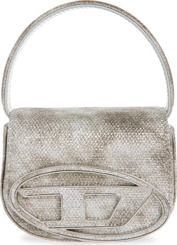 The label's oval logo dominates a signature shoulder bag that's rendered in richly textured fabric with a shimmering finish.