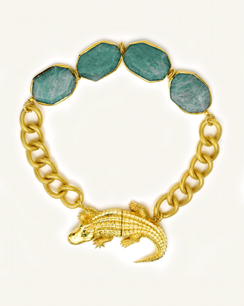 The Eye-Shine Necklace pays tribute to Florida's official reptile, the American alligator, and the unique Everglades National Park. With a detailed back clasp depicting an alligator and sparkling emeralds, this necklace captures the essence of Florida's subtropical environment.