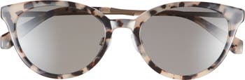A mixed-media design and angular cat-eye profile define everyday sunglasses fitted with polarized CR-39 lenses for glare reduction and superior clarity. Adjustable nose pads offer customized wear.