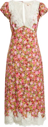 Light and airy, this slip-inspired maxi dress features floral eyelash-lace trim and bubbly puff sleeves.