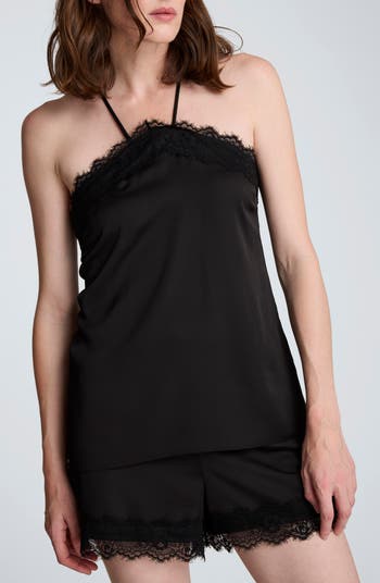 A halter-inspired neck with crisscross straps tops this soft satin top featuring eyelash-lace trim.