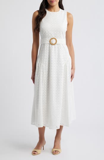 Crisp cotton eyelet enhances the breathable charm of this sleeveless flared maxi accented with a defining ring belt.